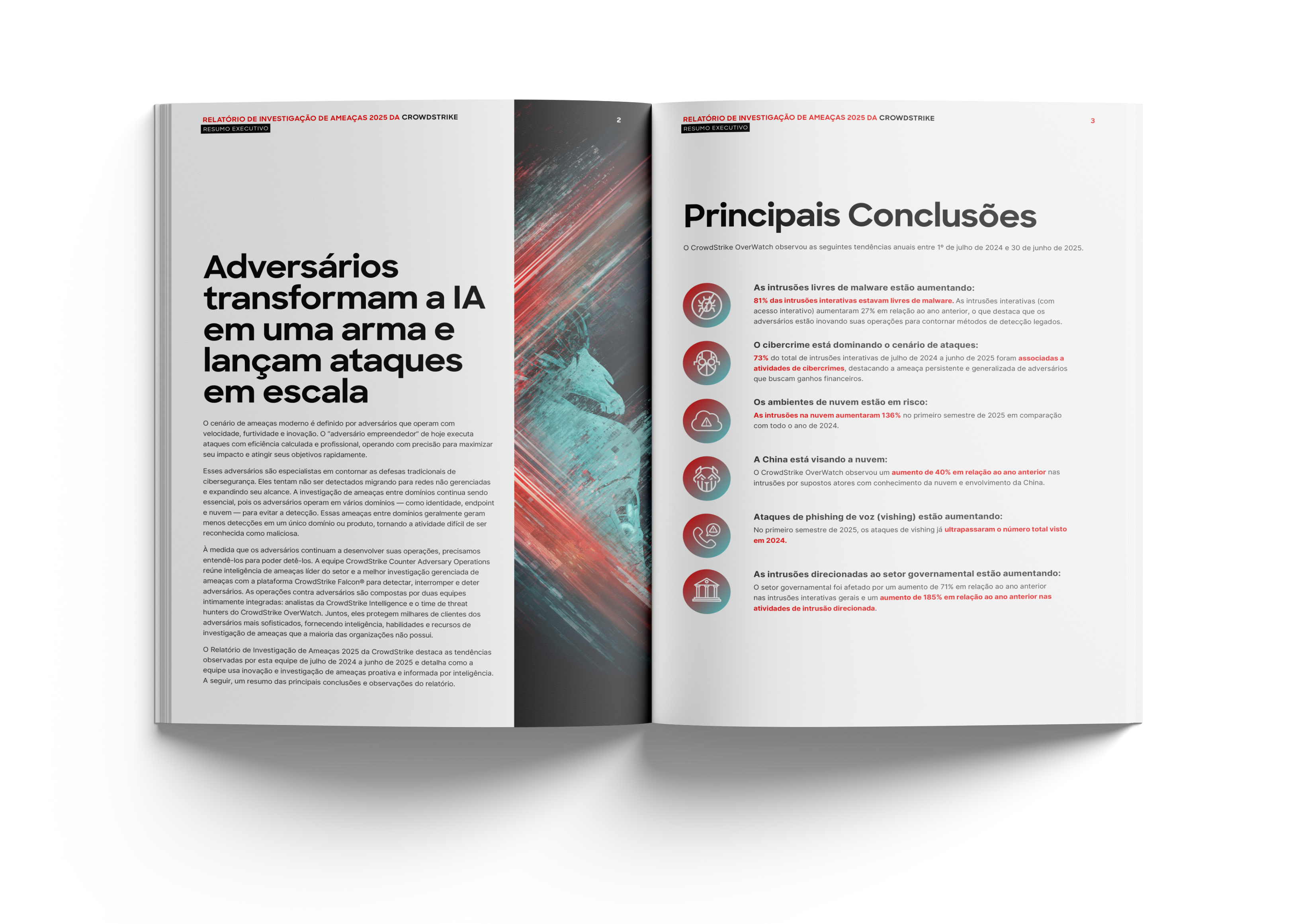 O relatório conta com insights concretos da equipe Overwatch da CrowdStrike. Nosso time especializado de threat hunters rastreia os adversários cibernéticos mais avançados, 24 horas por dia, 7 dias por semana. O Relatório de Investigação de Ameaças 2025 da CrowdStrike traz descobertas da linha de frente a partir de investigações ativas conduzidas entre 1º de julho de 2024 e 30 de junho de 2025.