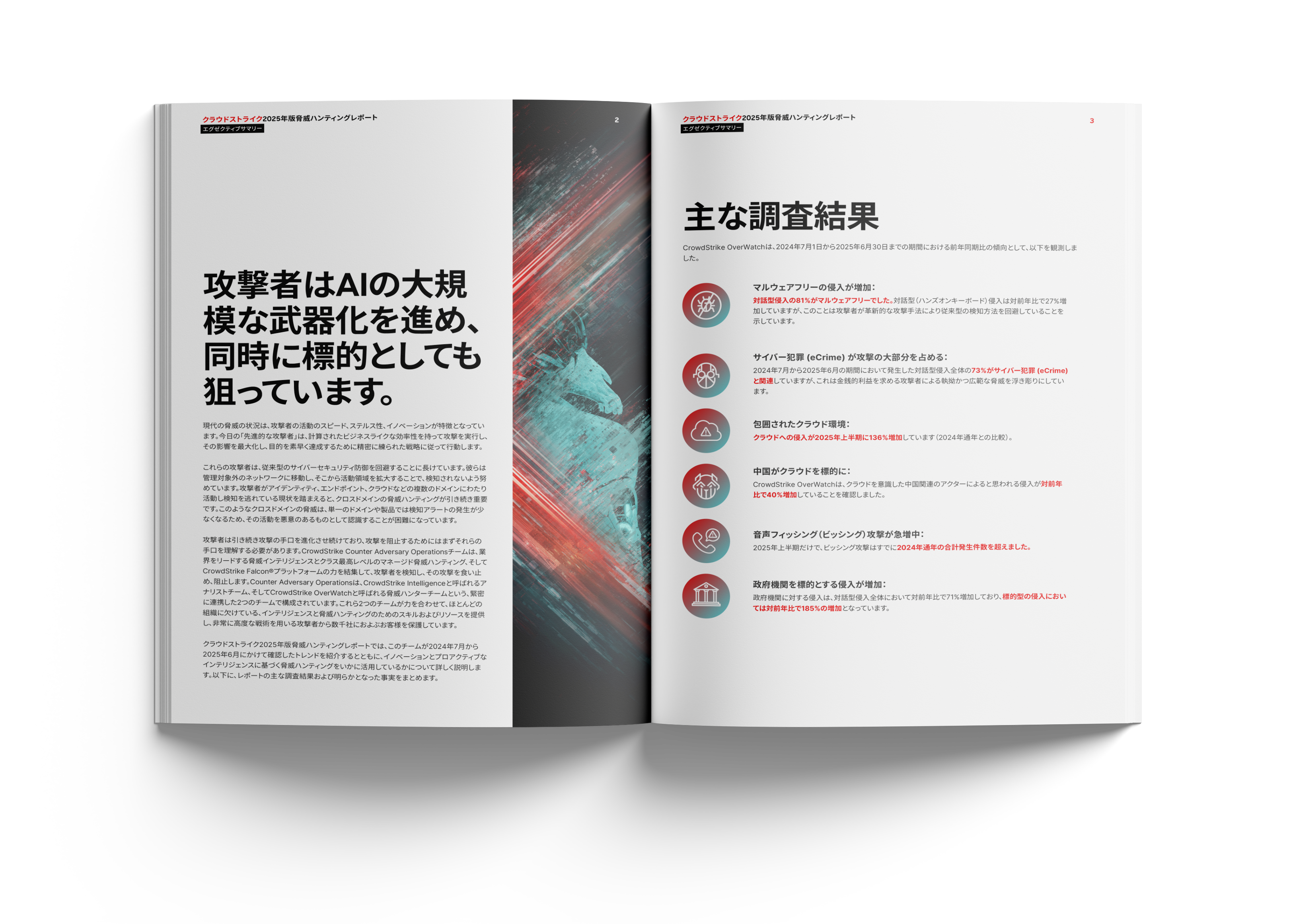 このレポートは、クラウドストライクが誇るOverWatchチームのインサイトをまとめたものです。当社の熟練した脅威ハンターは、世界で最も高度な攻撃者を24時間365日体制で追跡しています。クラウドストライク2025年版脅威ハンティングレポートは、2024年7月1日から2025年6月30日の期間中に実施された積極的な調査における最前線からの結果を反映しています。